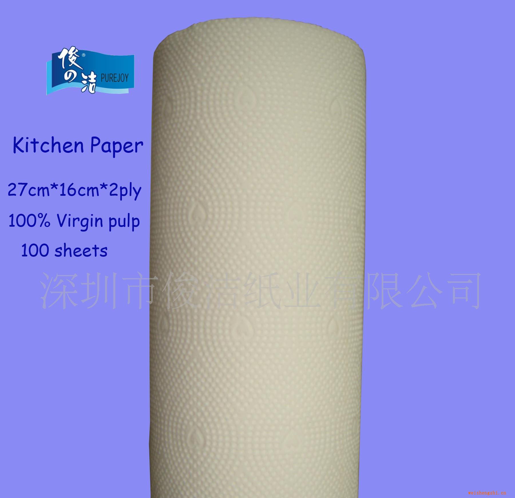 材质:100%纯木浆种类:厨房纸包装规格:单卷包装 30卷/箱 产地:深圳纸品等级:A级重量:20(g/m2) 型号:KT-6